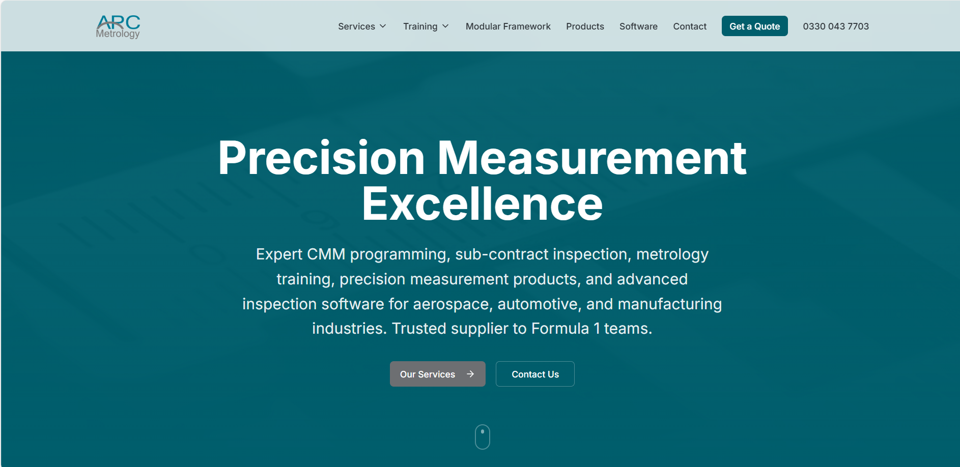 Professional metrology services site with service catalog, accreditations, and instant quote requests.